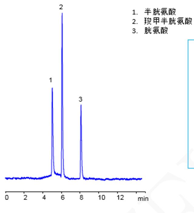 兩款色譜柱混合模式分離半胱氨酸、羧甲半胱氨酸與胱氨酸