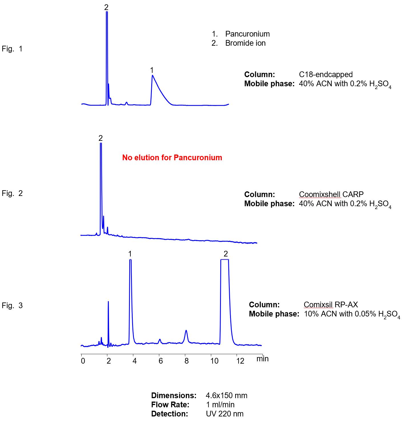Mixed-mode chromatography usually adds secondary and tertiary interactions which help to achieve controlled retention, unique selectivity and allow to adjust retention time of various compounds by changing the amount of organic, buffer concentration, buffer pH and buffer nature(混合模式色譜法通常增添二重和三重相互作用,有助于實(shí)現(xiàn)可控的保留,獨(dú)特的選擇性,并通過改變有機(jī)溶劑的含量,緩沖濃度,緩沖pH值和緩沖鹽的性質(zhì)來調(diào)整各種化合物的保留時(shí)間。 ). Presence of ionizable groups on the column also helps improve peak shape for various analytes, which sometimes is impossible to achieve with single mode columns.(色譜柱上存在可電離基團(tuán)也有助于改善各種分析物的峰形,一些時(shí)候,這在單一模式色譜柱上是不可能實(shí)現(xiàn)的) Pancuronium bromide is a hydrophobic compound with two strong basic groups. It shows a poor peak shape when RP columns are used(泮庫溴銨是一種具有兩個(gè)強(qiáng)堿性基團(tuán)的疏水化合物。當(dāng)采用RP柱時(shí),峰形較差。). The poor peak shape is attributed to secondary interaction between analyte and silanols on the surface of RP columns (分析物與在RP柱表面的硅烷醇二次相互作用導(dǎo)致峰形較差) (Fig. 1). Sometimes you need to understand what secondary interaction to add to improve your chromatography(有時(shí),你需要了解增加什么樣的二次相互作用來改善你的色譜方法). In case of pancuronium bromide, addition of cation-exchange mechanism did not work and target compound never eluted, (Fig. 2) even with very strong mobile phase from the column due to three strong interactions (reversed-phase and two cation-exchange interactions)(在泮庫溴銨的例子下,添加陽離子交換機(jī)制不起作用,目標(biāo)化合物也沒有洗脫(圖2)。即使柱內(nèi)流動(dòng)相洗脫能力很強(qiáng),存在三種強(qiáng)烈的相互作用(反相作用和兩種陽離子交換作用),化合物也沒有得到保留.)Problem of elution and peak shape was addressed by changing cation-exchange interaction to cation-exclusion interaction. This allowed to retain and analyze both the drug and counterion with simple isocratic conditions (Fig. 3)(通過將陽離子交換相互作用轉(zhuǎn)變?yōu)殛栯x子排斥相互作用,解決了洗脫和峰形問題。這樣就可以在簡單的等度條件下保留和分析藥物和反離子).