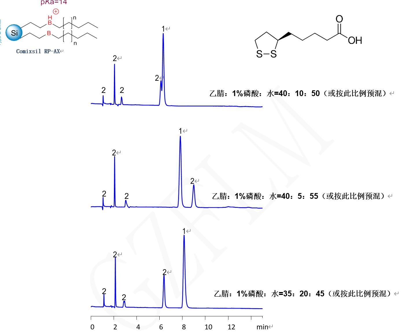 應用說明:α-硫辛酸具有疏水基團和羧酸基團,利用 Comixsil RP-AX 與其的疏水作用和離子交換作用保留的分離。