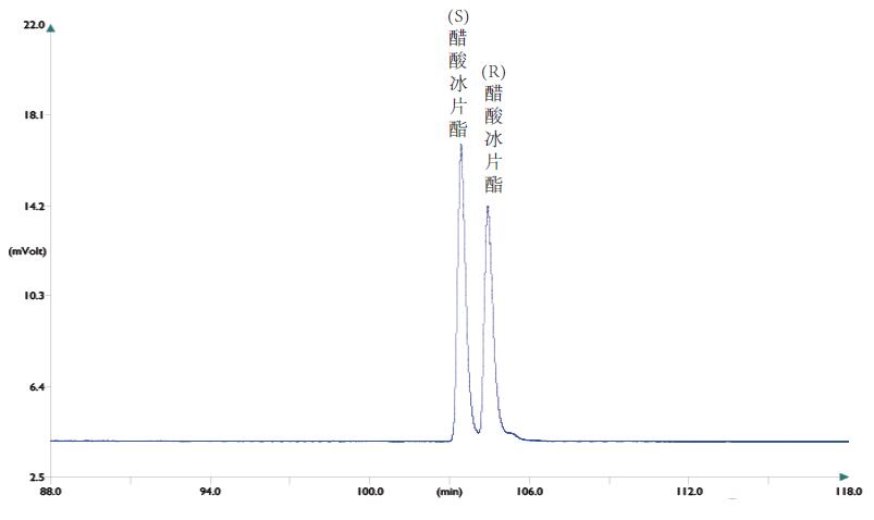實際樣品中含有95% -97% 的醋酸冰片酯和3% 的異冰片酯,醋酸冰片酯的s 對映體豐度極高, 樣品用正己烷配制成 lμL/mL。